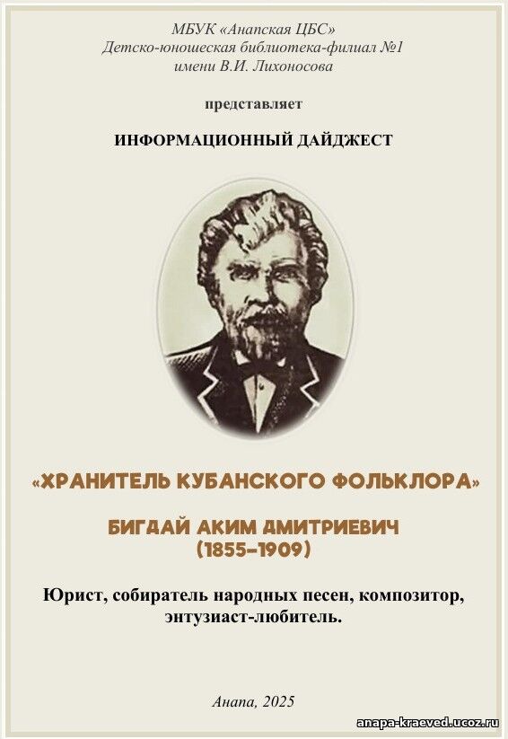 К 170-летию со дня рождения Акима Дмитриевича Бигдая – одного из первых исследователей казачьего народного песенного творчества представляем информационный дайджест «Хранитель кубанского фольклора».