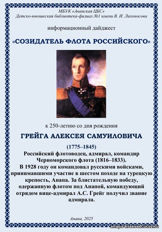 К 250-летию со дня рождения русского адмирала Алексея Самуиловича Грейга представляем информационный дайджест «Созидатель флота российского».